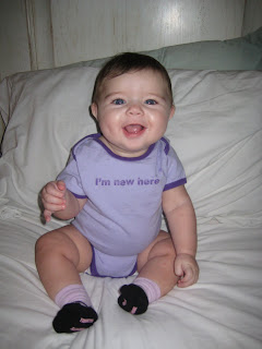 Awe, she is getting so big! I love the I’m New Here onsie.