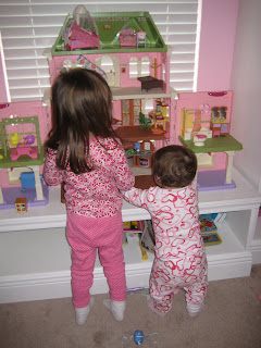 To cute! I also love how their outfits seem to match the dollhouse. My two also play together sometimes, as long as the older one can boss her brother around!