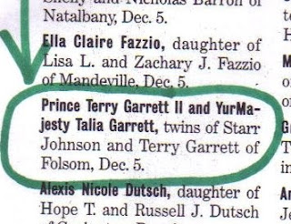 This was in our paper last week in the Birth Announcement section. Um. Yeah. Hail to the new royal babies!