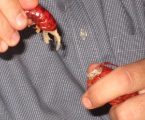 Discard the head and concentrate on the tail (where the meat is!). Hold the bottom of the tail in your right hand, and the top of the tail in your left. Twist your right hand and pull the tip of the tail away from the rest. This should devein the tail (or as we call it, remove the poop line). It should be noted that not everyone deveins their crawfish, but it is something I always do. You may find a small amount of yellow substance on the meat which is the “fat.” Once your crawfish tail is deveined, you can peel away the red outer shell and remove the meat. Enjoy and repeat….alot!