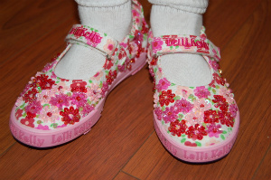 Atterdag Kids carries tons of options for baby gifts or even something adorable for your own little one! They carry a HUGE range of top children’s designers that are sometimes hard to find in your local stores. The website is very user-friendly, allowing you to shop by brand, see what’s on sale, and they give you a great view of everything they have to keep your little one looking like the best dressed kid on the block. Atterdag Kids features some of my favorite designers, like Wes and Willy (they have the coolest boys’ tees ever), Lelli Kelly shoes, and a truckload of options from Kissy Kissy, who makes the sweetest baby clothes on the planet. Atterdag Kids was so kind to send my little shoe maven Emily a pair of Lelli Kelly Primula shoes to try out. Emily loved the sparkly sequins and overall girly-ness so much that she could not stop staring at them…literally.