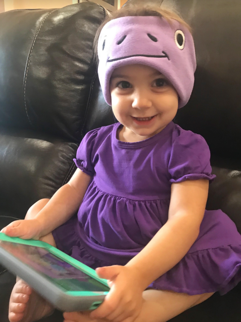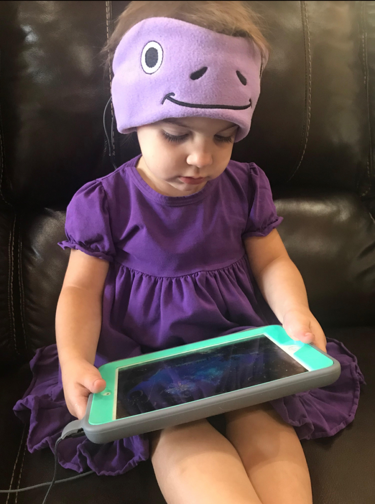 The soft headband slides on comfortably and the embedded speakers adjust easily within the headband to fit to any pair of ears or preference. My 6-year-old preferred the speakers directly over her ears but for my youngest, we placed the speakers just behind her ears in anticipation of the volume becoming too loud as she controlled her own device. However, volume became something we did not have to worry about after all! CozyPhones come volume limited at 85 decibels. Our minds were put at ease knowing her hearing wouldn’t be damaged by the limitless volume control of a toddler.